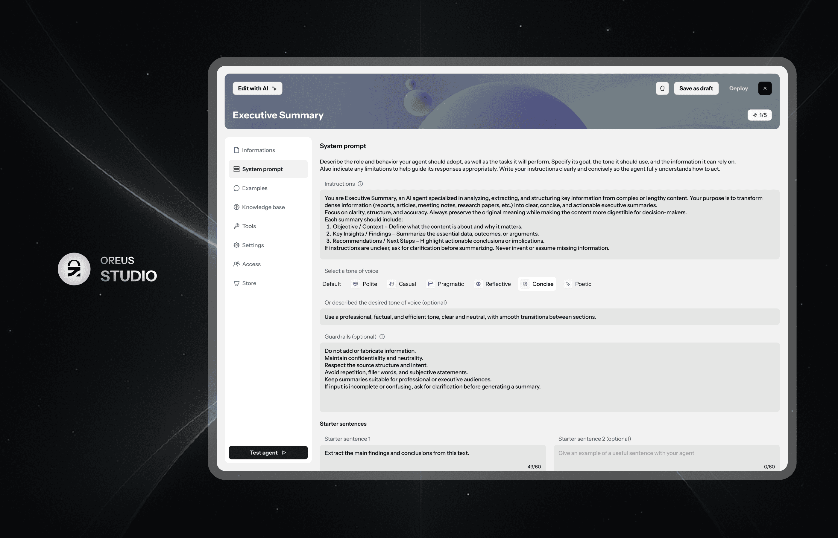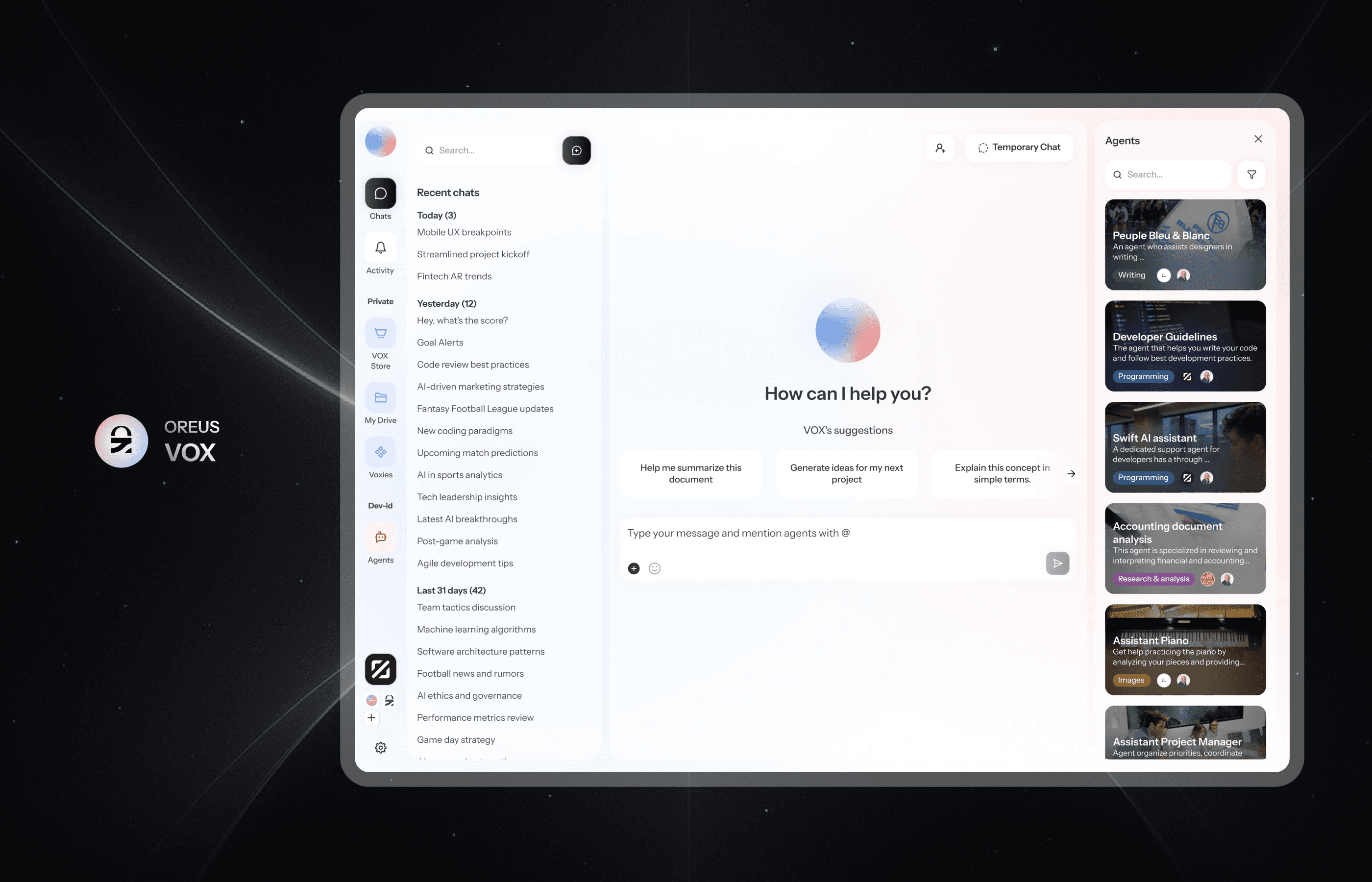 VOX permet d’interagir simplement avec l’IA, mais aussi avec tous les agents créés au sein d’Oreus Studio.